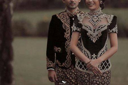 Selain menggunakan gaun putih, dalam potret foto lain, pasangan yang menjalani masa pacaran selama 12 tahun itu tampil kompak dengan pakaian serba hitam.